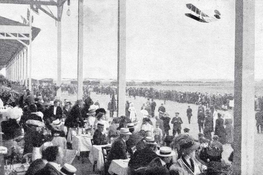 22 августа 1909 года в Реймсе, Франция, открылась Авиационная неделя, в ходе которой состоялось первое в мире авиашоу. Событие привлекло авиаторов и авиаконструкторов со всей Европы, 38 аэропланов подали заявку на участие в состязаниях, но взлететь смогли только 23 машины. На фото: биплан, пролетающий мимо зрительской трибуны во время Авиационной недели в Реймсе в 1909 году