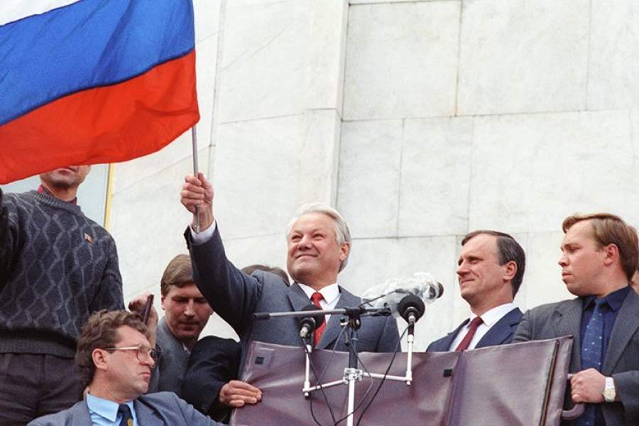 22 августа отмечается День Государственного флага Российской Федерации. В этот день в 1991 году члены Верховного Совета РСФСР на утреннем заседании приняли постановление о национальном флаге, а днем во время митинга вынесли огромное бело-сине-красное полотнище. На фото: президент РСФСР Борис Ельцин и государственный секретарь РСФСР Геннадий Бурбулис (справа от Ельцина) на трибуне во время митинга