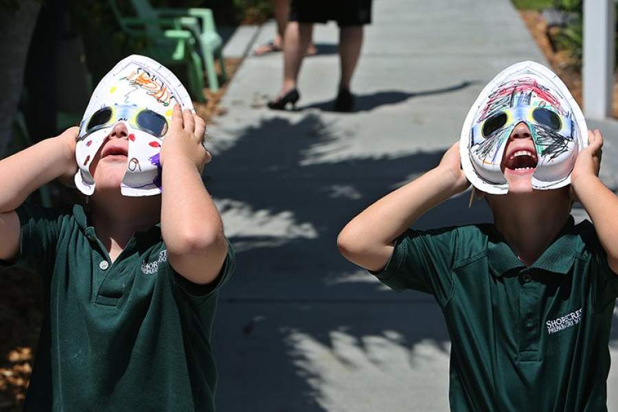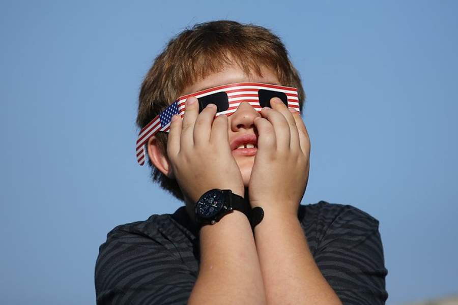 Мальчик во время наблюдения затмения в Депо Бэй, штат Орегон