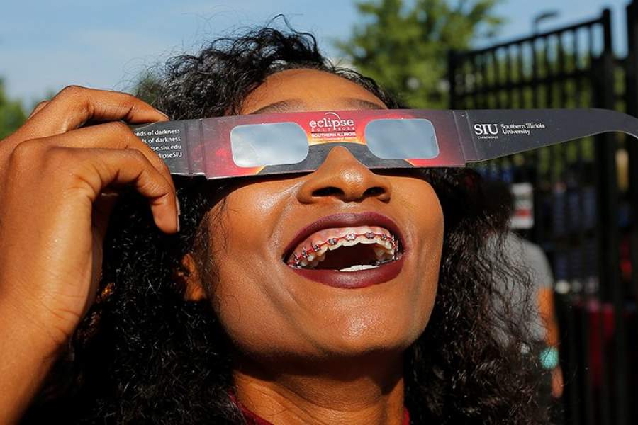 Жительница штата Иллинойс смотрит на затмение на стадионе города Карбондейл