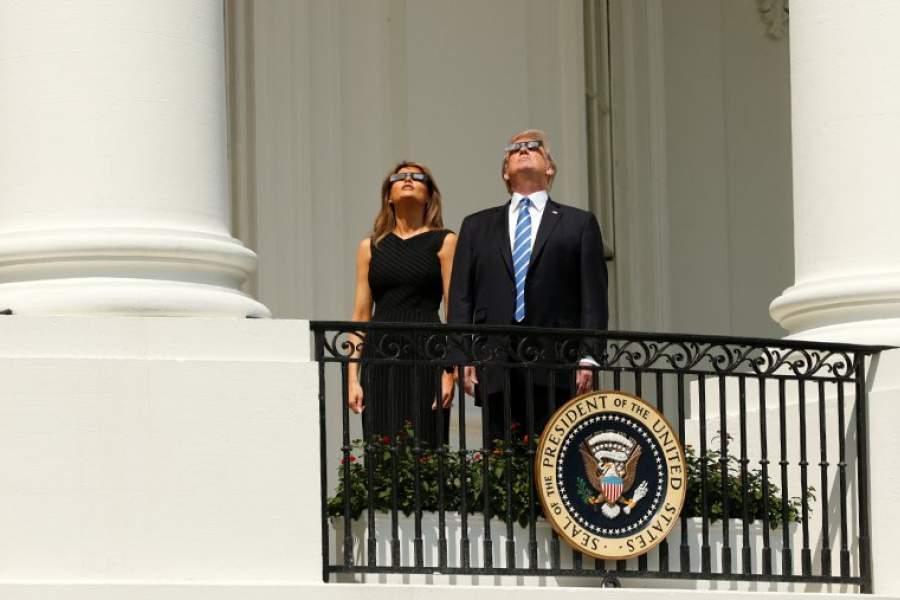 Президент США Дональд Трамп вместе с женой Меланией наблюдают затмение с балкона Трумэна, расположенного с южной стороны Белого дома