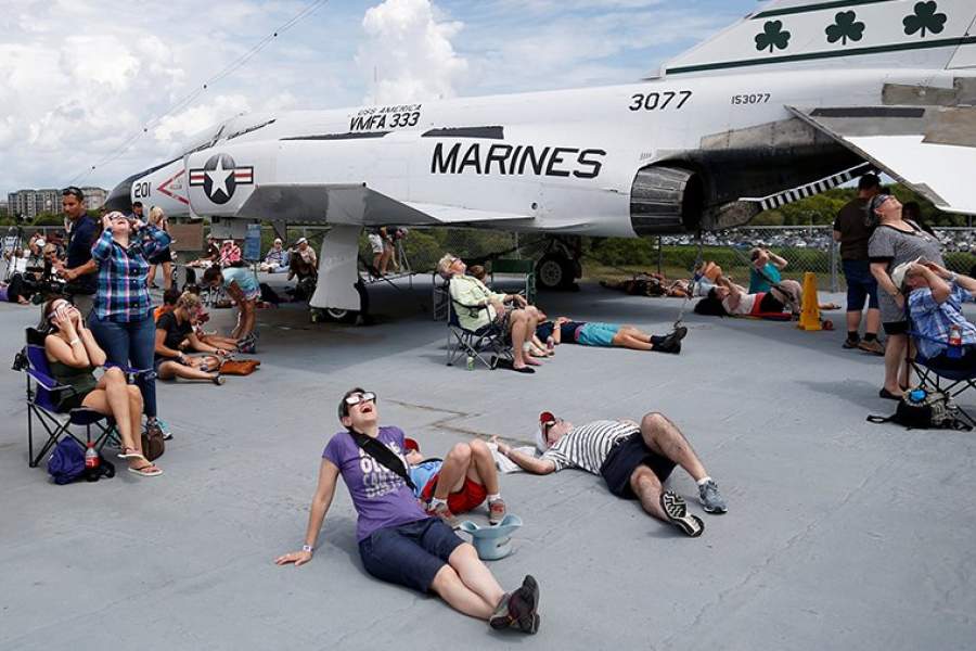 Жители во время затмения на летной площадке Военно-морского музея в городе Маунт-Плезант в Южной Каролине