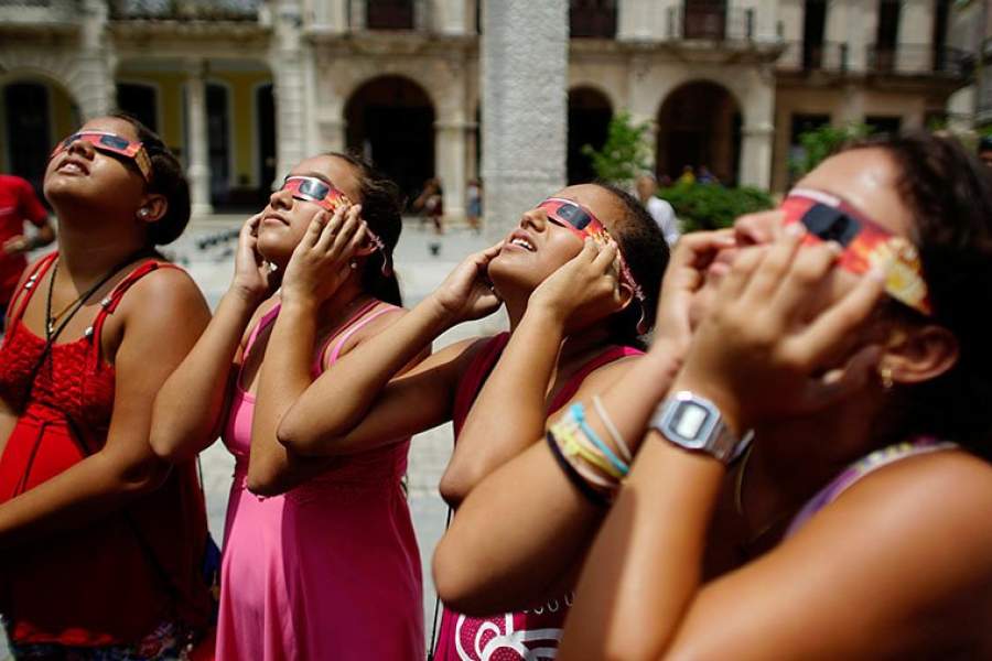 Частичное затмение наблюдалось не только в США, но и в других странах континента. На фото: дети в центре столицы Кубы, Гаваны, наблюдают затмение