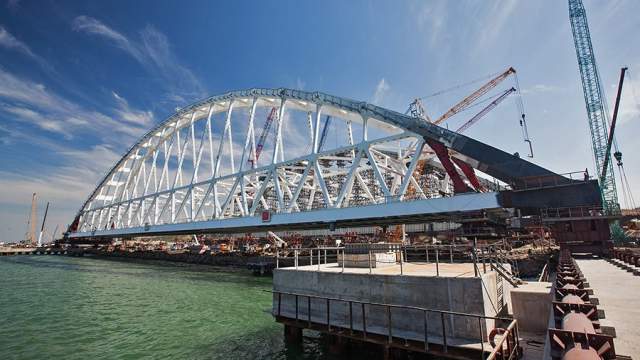 «Плавучие опоры доставили ночью железнодорожный арочный пролет Крымского моста в Керченский пролив — к фарватерным опорам — и завели в створ моста для подъема на проектную высоту», — говорится в сообщении.