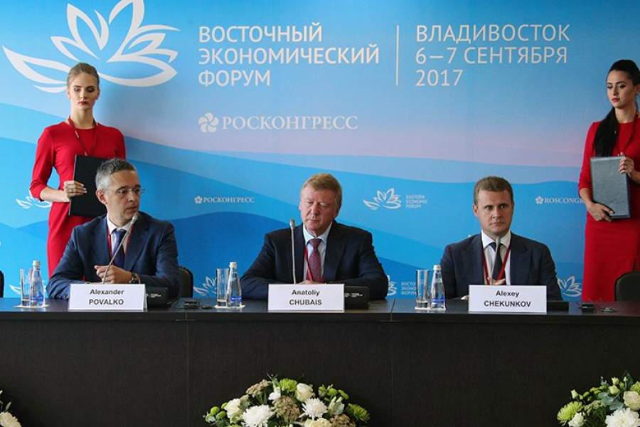 Генеральный директор АО РВК Александр Повалко, председатель правления ООО «УК «Роснано» Анатолий Чубайс и генеральный директор Фонда развития Дальнего Востока Алексей Чекунков (слева направо) во время церемонии подписания соглашения между ООО «УК «Роснано» и Фондом развития Дальнего Востока и Байкальского региона