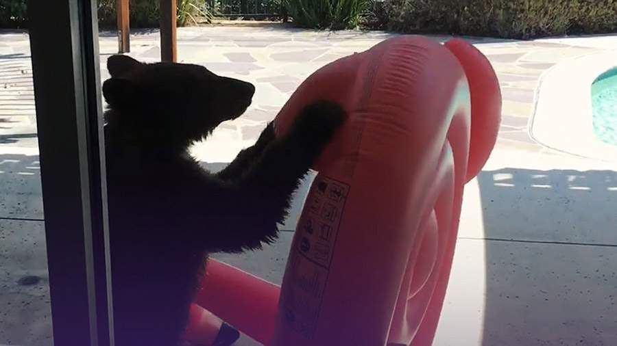 В США маленький медвежонок устроил поединок с надувным фламинго. Детеныш пришел во двор одного из домов поиграть. Люди спрятались, но наблюдали за ним через стекло. Тогда косолапый решил устроить схватку с игрушкой для бассейна. По словам местных жителей, медведь приходил уже в не первый раз.