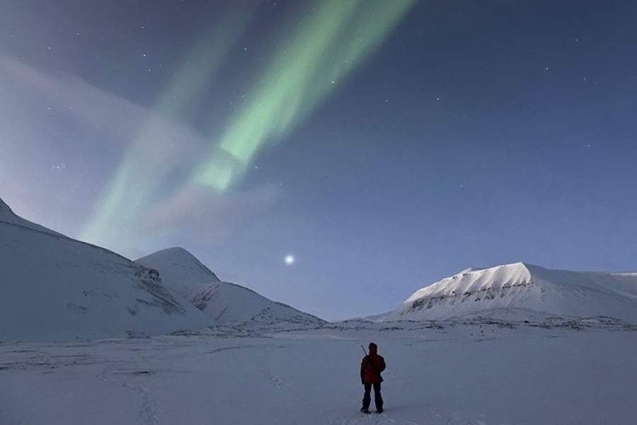 Человек наблюдает за полярным сиянием и звездным небом на одном из островов архипелага Шпицберген