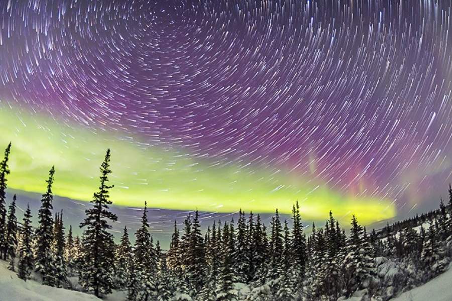 Незаходящие звезды и северное сияние в канадской провинции Манитоба