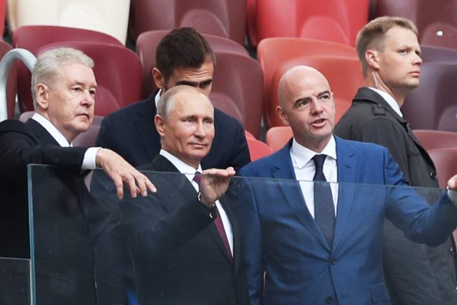 Владимир Путин принял участие в церемонии старта тура Кубка чемпионата мира по футболу-2018 на стадионе «Лужники». На фото: мэр Москвы Сергей Собянин, президент РФ Владимир Путин и президент Международной федерации футбола (ФИФА) Джанни Инфантино