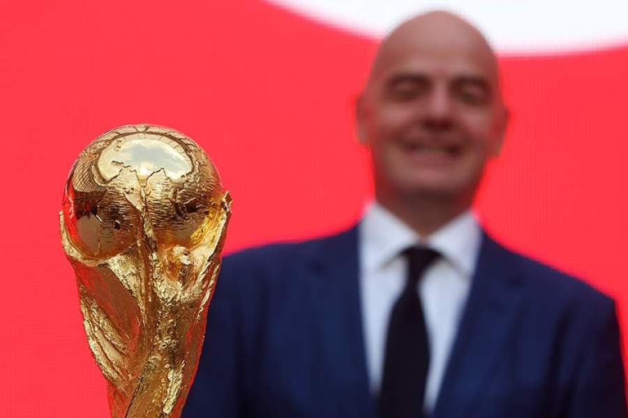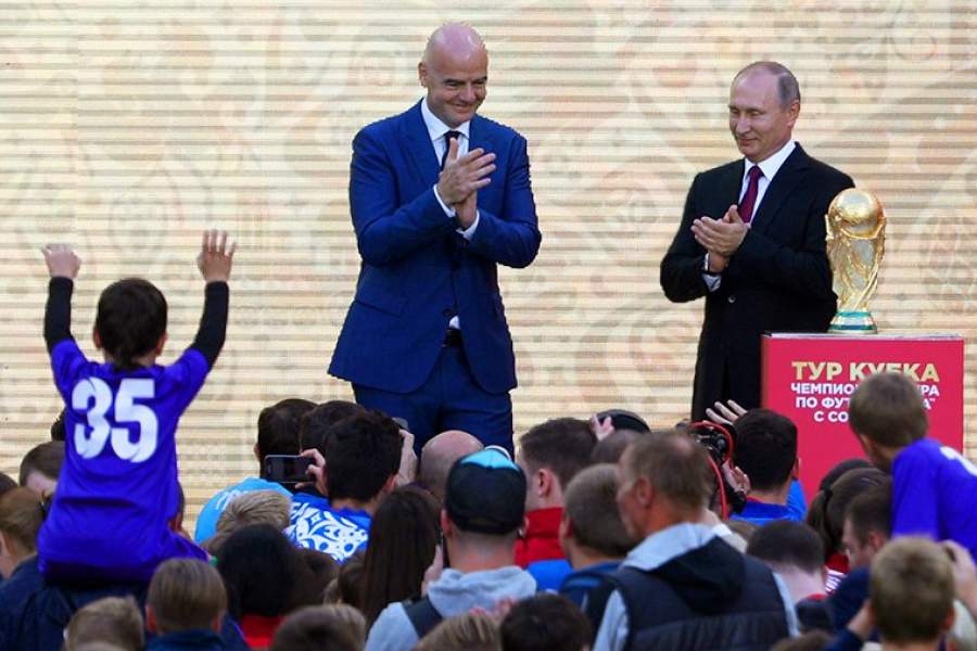 Владимир Путин и президент Международной федерации футбола (ФИФА) Джанни Инфантино во время церемонии старта тура Кубка чемпионата ФИФА-2018