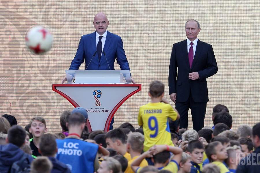 Владимир Путин (справа) и президент ФИФА Джанни Инфантино дали старт туру Кубка мира по России во время посещения стадиона «Лужники»