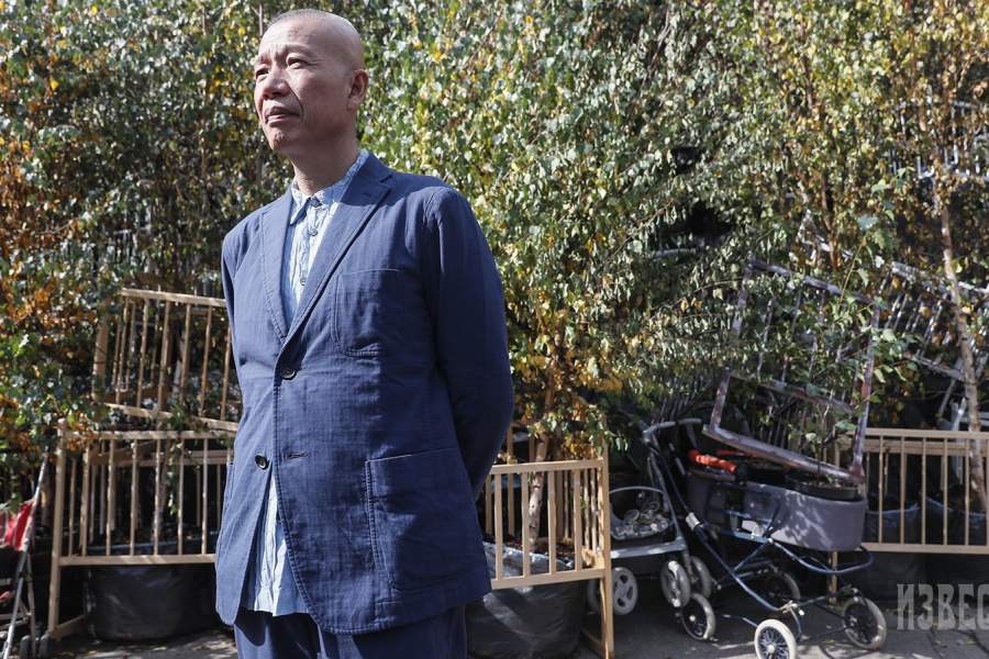 Современный китайский художник Цай Гоцян перед своей инсталляцией, созданной во дворе Пушкинского музея в Москве к открытию выставки «Октябрь»