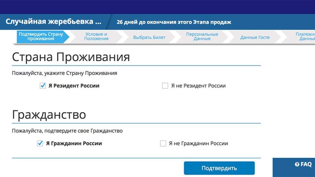 Сперва необходимо зарегистрироваться на официальном сайте ЧМ-2018 и оставить заявку на билеты. При этом нужно указать, являетесь ли вы гражданином и резидентом России (сайт предложит все возможные комбинации ответов). После этого вы попадете, собственно, на страницу выбора билетов.