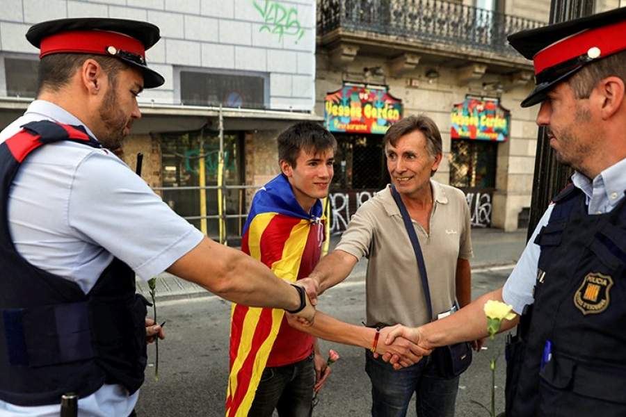 Испанские власти назвали референдум неконституционным, в середине сентября были арестованы несколько членов каталонского правительства, после чего начались массовые акции в поддержку референдума. На фото: митингующие пожимают руки офицерам полиции