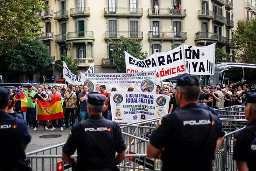 Сотрудники испанской национальной полиции в оцеплении во время массовых акций протеста
