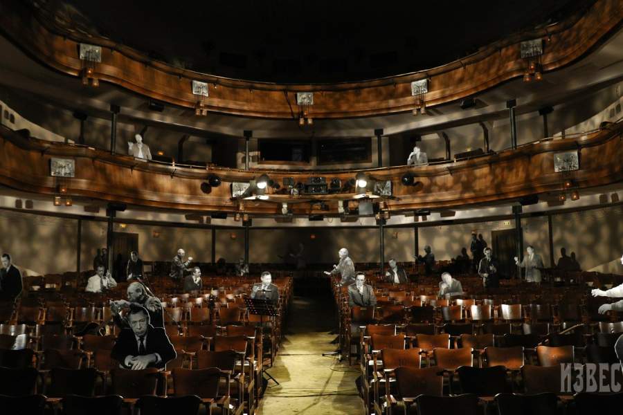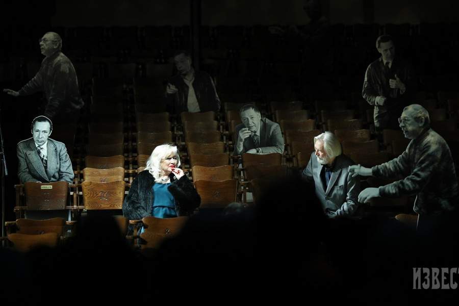 В зале Основной сцены театра была воссоздана атмосфера репетиции Ефремова: стоял его режиссерский стол, дымилась в пепельнице сигарета, звучал голос, на экране шли документальные кадры, запечатлевшие его работу в театре