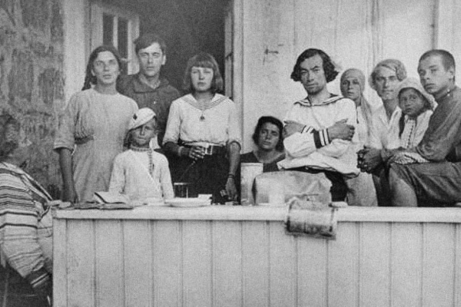 Елена Волошина, Вера Эфрон, Сергей Эфрон, Марина Цветаева, Елизавета Эфрон, Владимир Соколов, Мария Кудашева, Михаил Фельдштейн, Леонид Фейнберг (слева направо). Коктебель, 1913 год