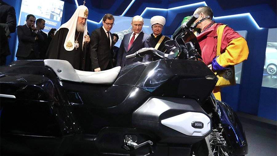 Тяжелый мотоцикл «Иж» из проекта «Кортеж», автором разработки которого является концерн «Калашников», представили президенту России Владимиру Путину в Манеже, где проходит выставка «Россия, устремленная в будущее».