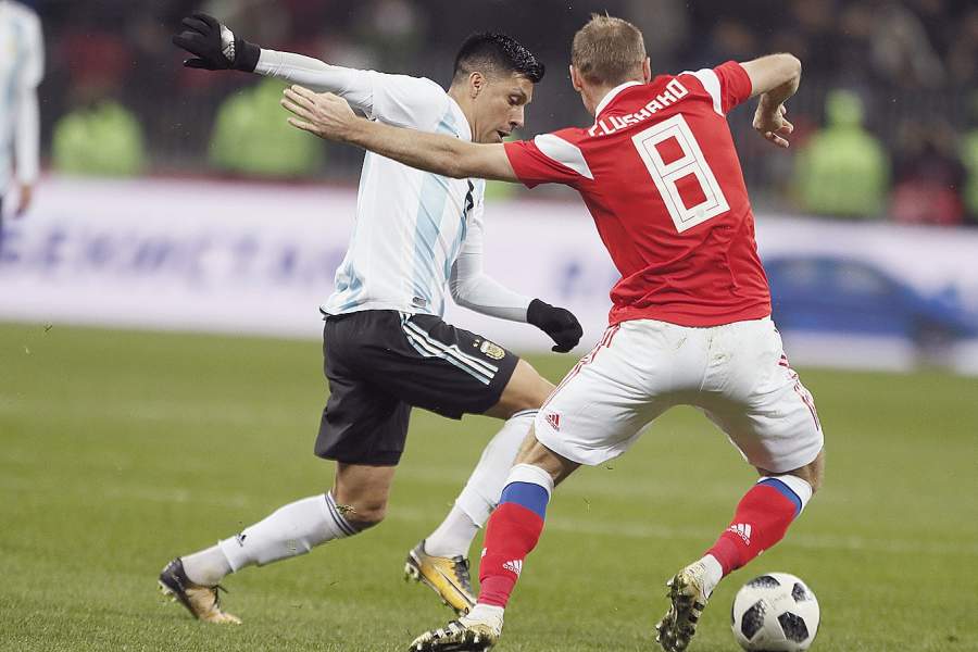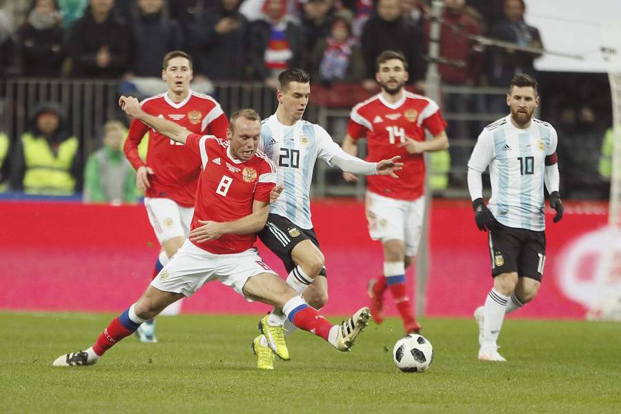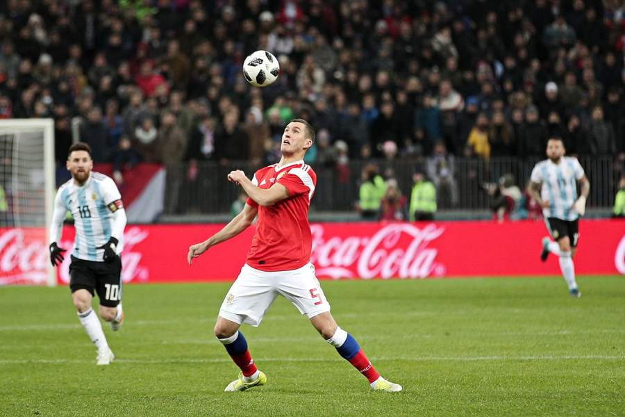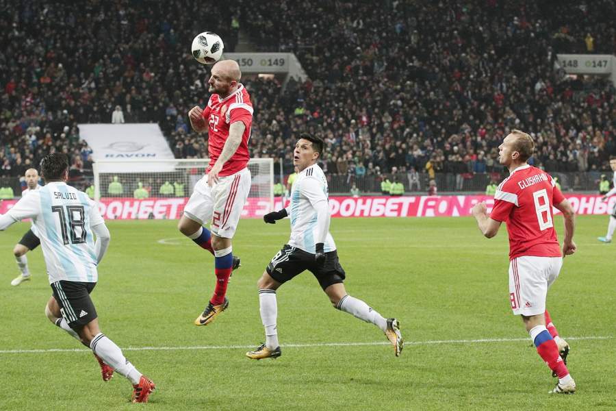 Денис Глушаков, футболист сборной России, с игроком из Аргентины во время встречи на стадионе «Лужники»