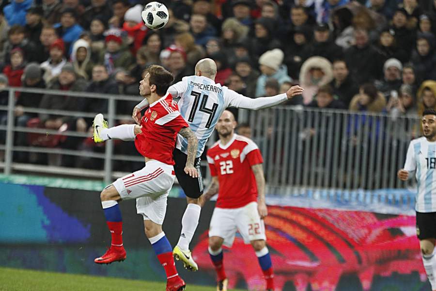 Футболисты Федор Смолов и Хавьер Маскерано борются за мяч во время игры в товарищеском матче