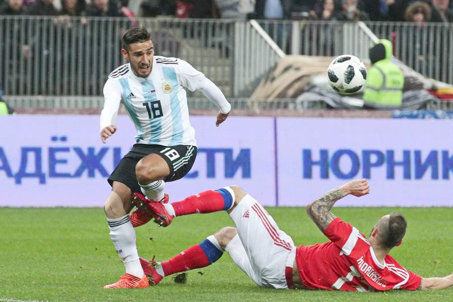 Денис Глушаков и Джованни Ло Чельсо в товарищеском матче между сборными командами России и Аргентины