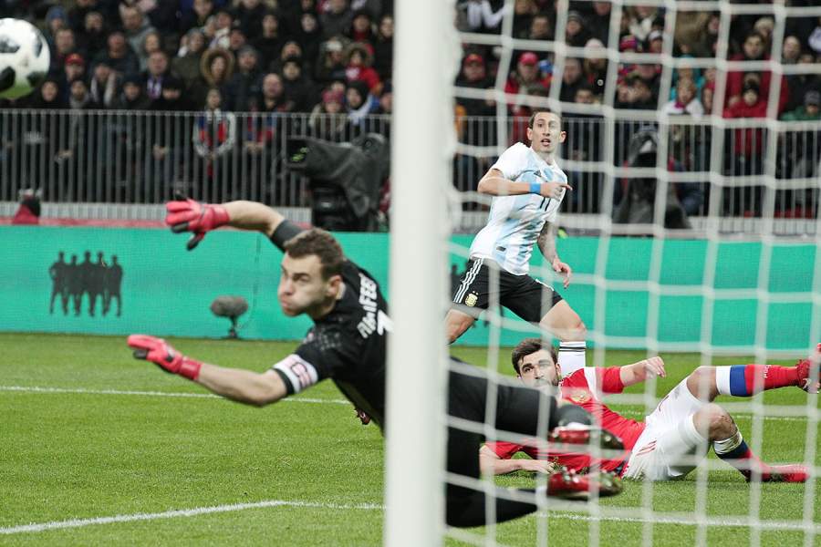 Вратарь российской сборной Игорь Акинфеев отражает удар игрока Аргентины Анхель Ди Марии