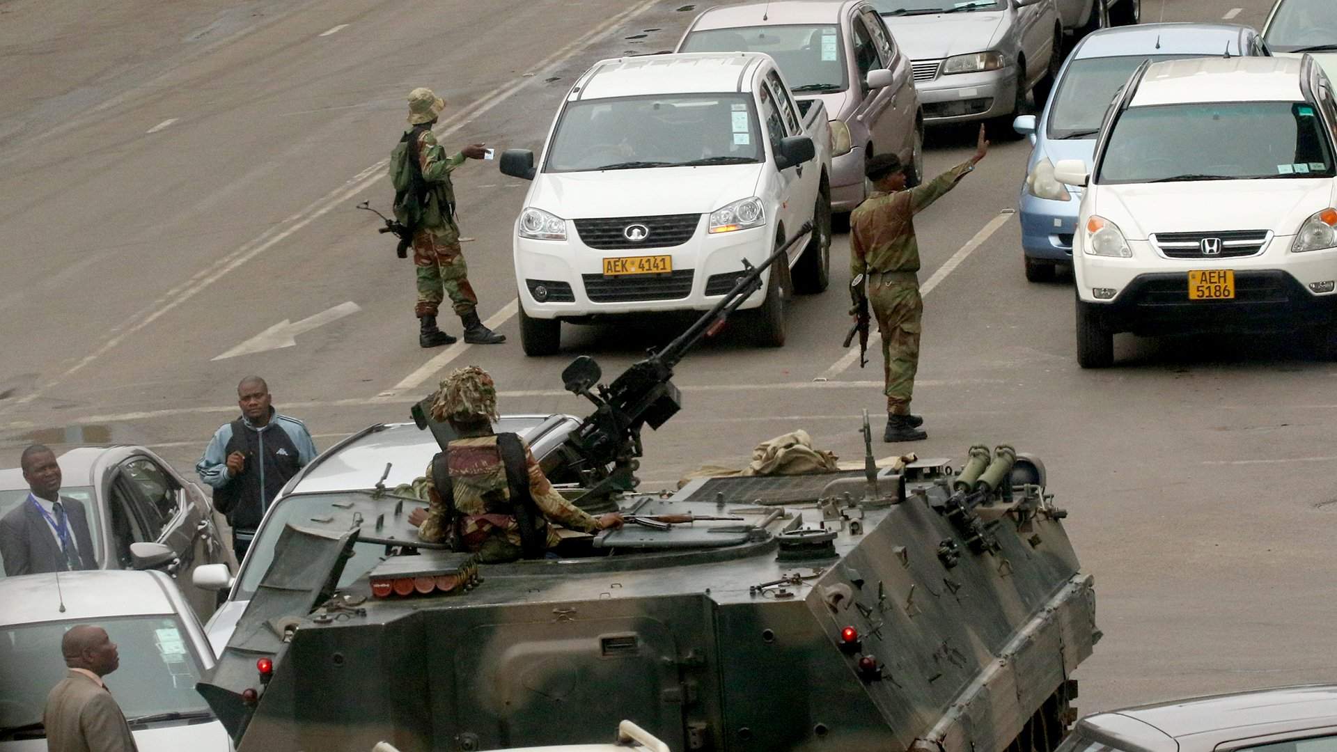 О том, что в Зимбабве не всё ладно, слухи поползли вечером во вторник, 14 ноября. Очевидцы сообщали о движении бронированных машин в сторону столицы. На размещенных в соцсетях видео местные, которым повезло стать свидетелями исторических событий, взволнованными голосами рассказывали, как мимо них по дороге «только что проехали два, три, много танков». За танки они, судя по редким видеокадрам, принимали китайские бронемашины «тип 85», состоящие на вооружении зимбабвийской армии. Одна из них по дороге сломалась, и весь мир облетели кадры, ставшие символом переворота, — два грустных чернокожих солдата, уныло сидящих на броне загнанной на обочину бронемашины без одной гусеницы.