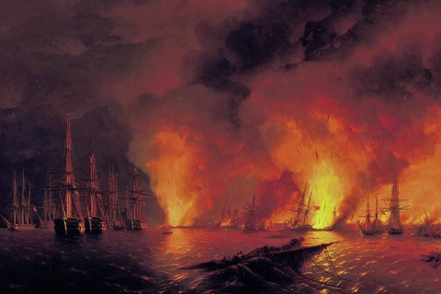 30 ноября 1853 года состоялось Синопское сражение, в ходе которого силы русской эскадры под командованием Павла Нахимова разгромили силы турецкого флота. На фото: фрагмент картины И.К. Айвазовского «Синоп. Ночь после боя 18 ноября 1853 года»