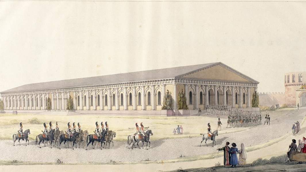 По вполне понятным причинам главным городом предстоящих торжеств выбрали не оставшийся в стороне от боев Санкт-Петербург, а израненную войной Москву. Французы покинули Первопрестольную в октябре, границу последние отступавшие части (в том числе австрийские и прусские) пересекли под Рождество, праздновать же решили где-то посередине. Но вот беда: московская погода конца осени — начала зимы не слишком подходит для парадов. Тут и появилась смелая идея создать закрытое сооружение, в котором можно будет провести торжественное построение и парад целого сводного кавалерийского полка, то есть около 2 тыс. сабель.