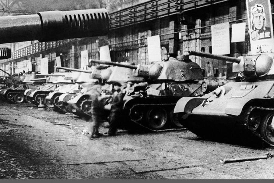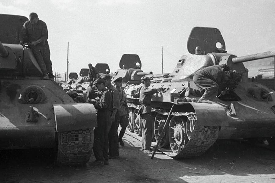 Всего за годы войны было выпущено свыше 50 тыс. «тридцатьчетверок». На фото: танки Т-34 на Челябинском тракторном заводе перед отправкой на фронт, 1943 год