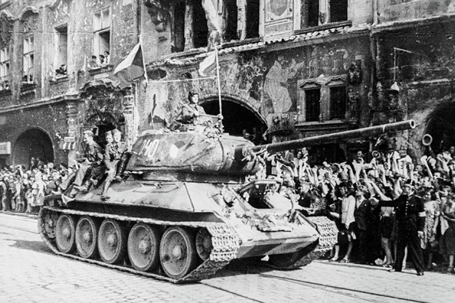 Жители Праги приветствуют советских танкистов после освобождения города советскими войсками, 7-12 мая 1945 года