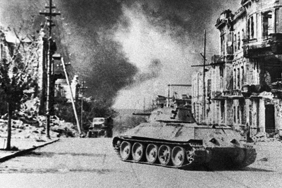 Советский танк Т-34 на одной из улиц освобожденного Севастополя, 1944 год