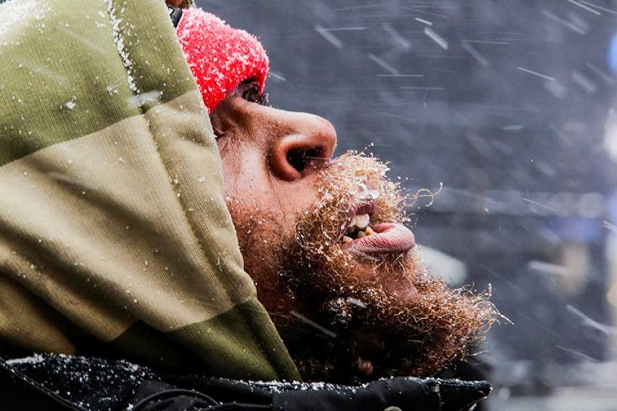 Мужчина смотрит на падающий снег, Манхэттэн, Нью-Йорк