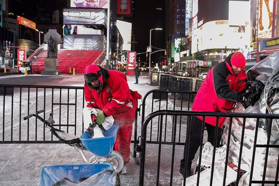 Рабочие убирают снег во время метели на Таймс-Сквер на Манхэттене, Нью-Йорк