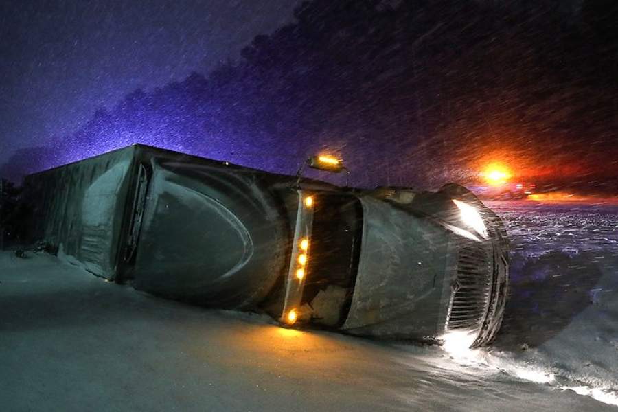 Грузовик, перевернутый во время снежной бури в Джорджтауне, штат Делавэр
