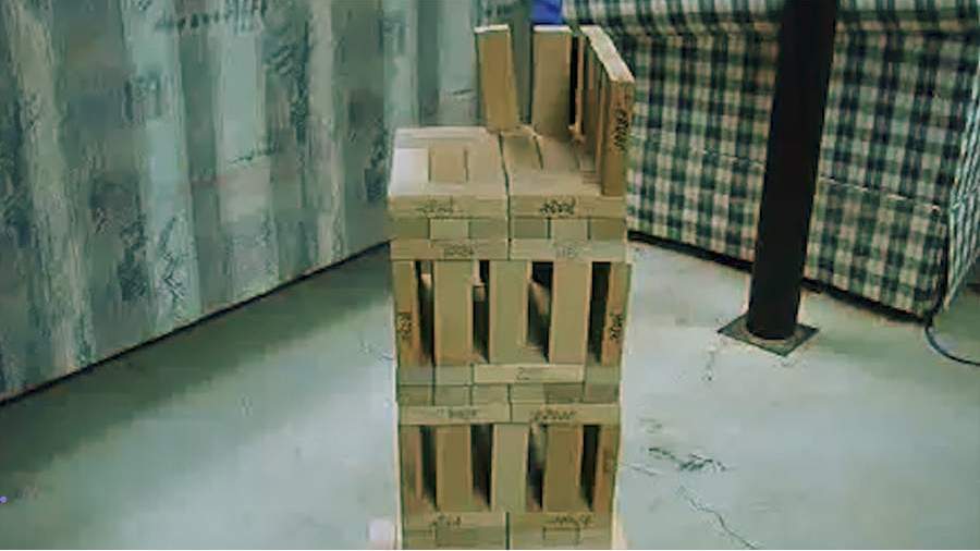Гигантская башня Дженга, один строитель и десятки зрителей. Вьетнамский уличный художник, похоже, решил поставить рекорд. Высотка уже достигла пары метров в высоту. Как вдруг на нее случайно падает маленький ребенок. Рекорда не получилось.