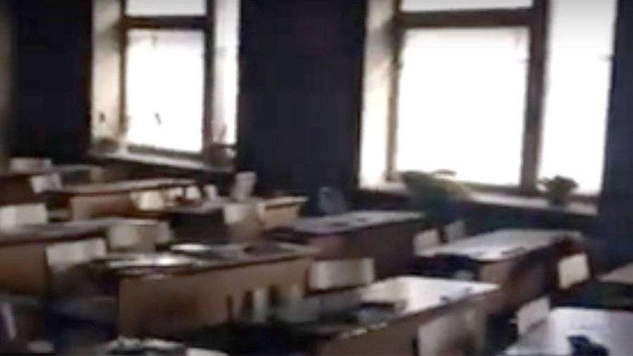 На видеозаписи СК виден класс школы, в котором произошло нападение школьника на учащихся. На кадрах видны сдвинутые парты, разбросанные вещи и обвалившаяся штукатурка.