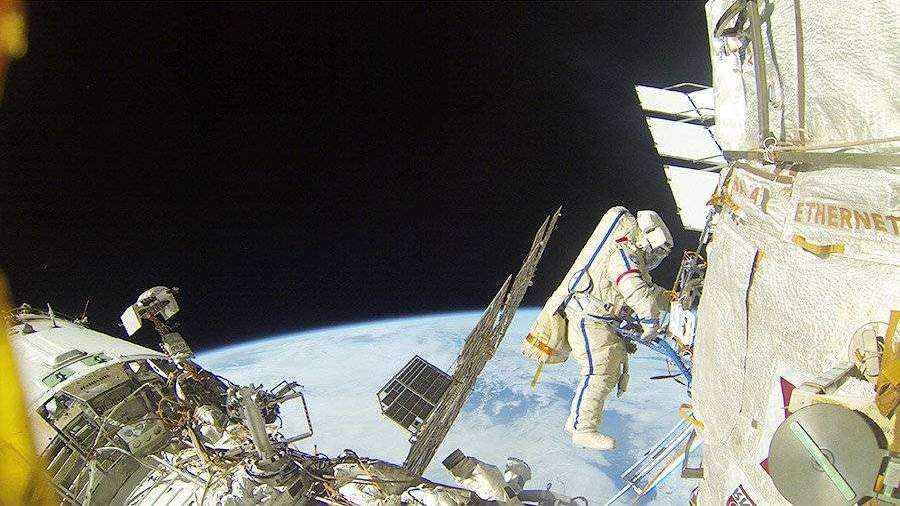 Российские астронавты в открытом космосе демонтируют модуль связи