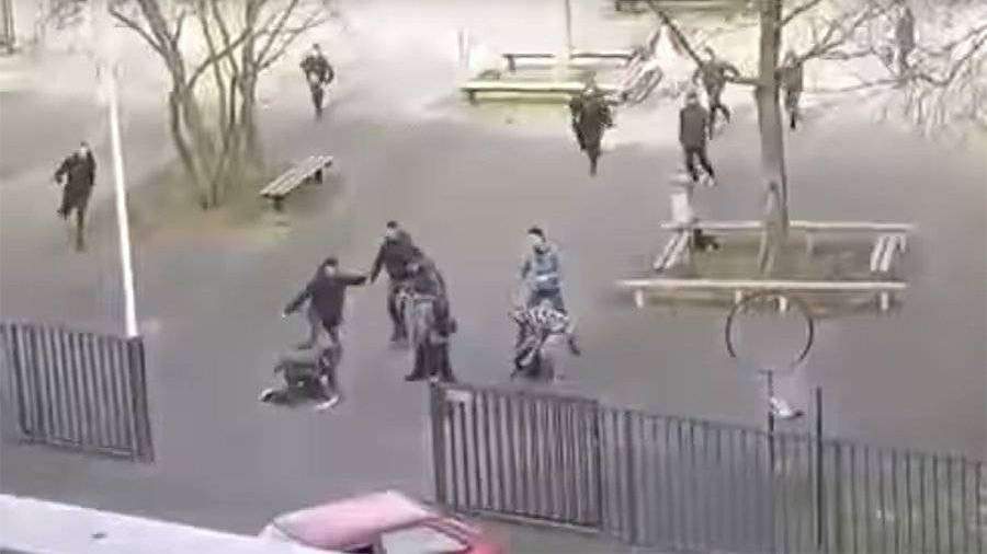 На видео запечатлено как несколько подростков бегут за мужчиной, в руках у которого два ножа. При этом он ни на кого не нападает. Несколько студентов приближаются к вооруженному человеку и бросают рюкзак, после чего он убегает.
