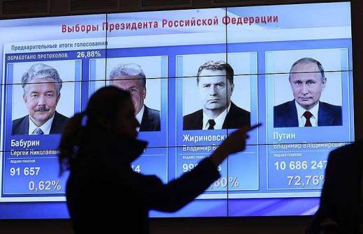 Выборы президента РФ прошли 18 февраля. Действующий глава государства Владимир Путин набрал рекордные 76,68% голосов избирателей при явке в 67,4%.