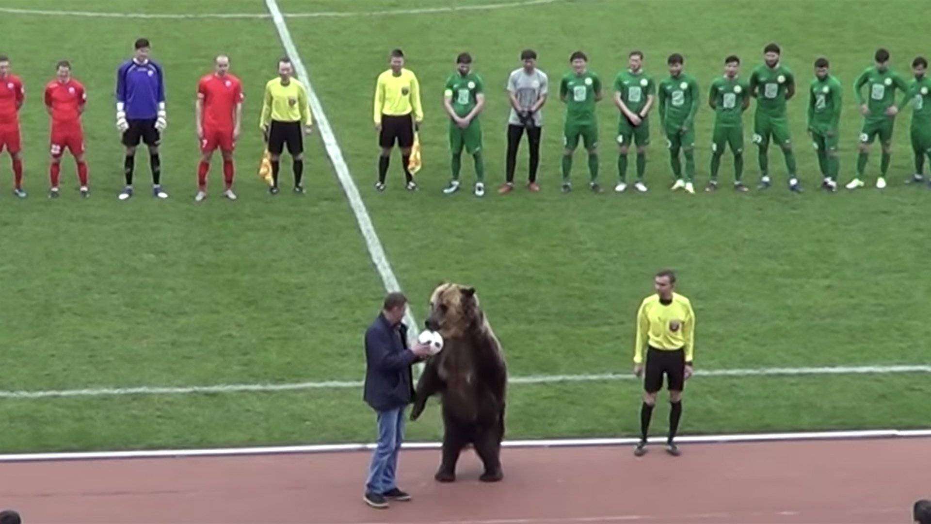 Живой медведь по кличке Тима открыл матч Профессиональной футбольной лиги (ПФЛ) в Пятигорске между командами «Машук» и «Ангушт».