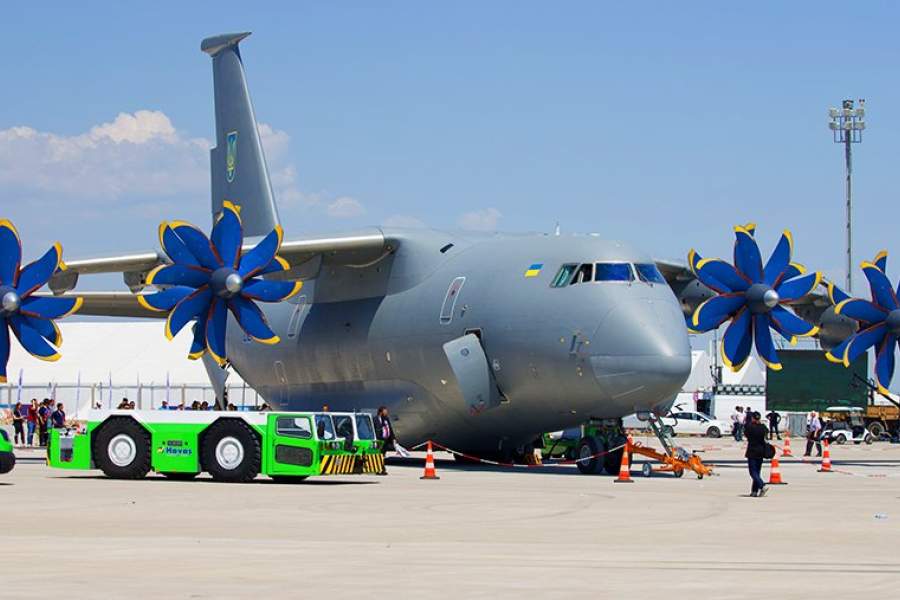 Российско-украинский военно-транспортный самолет Ан-70 концерна «Антонов». Российский флаг на фюзеляже закрашен — по политическим причинам