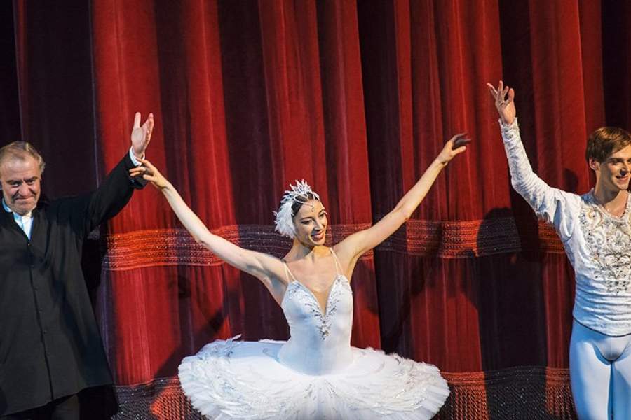 Валерий Гергиев и артисты балета Мариинского театра Виктория Терёшкина и Владимир Шкляров после постановки «Лебединое озеро» в Нью-Йорке в 2015 году