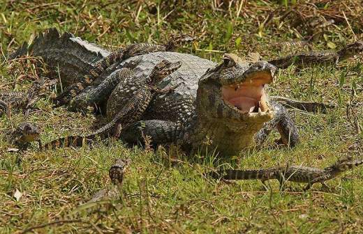 Во Флориде гольфист снял видео прогулки стаи гусей и аллигатора. На кадрах видно, как восемь птиц идут за рептилией и громко гогочут.
