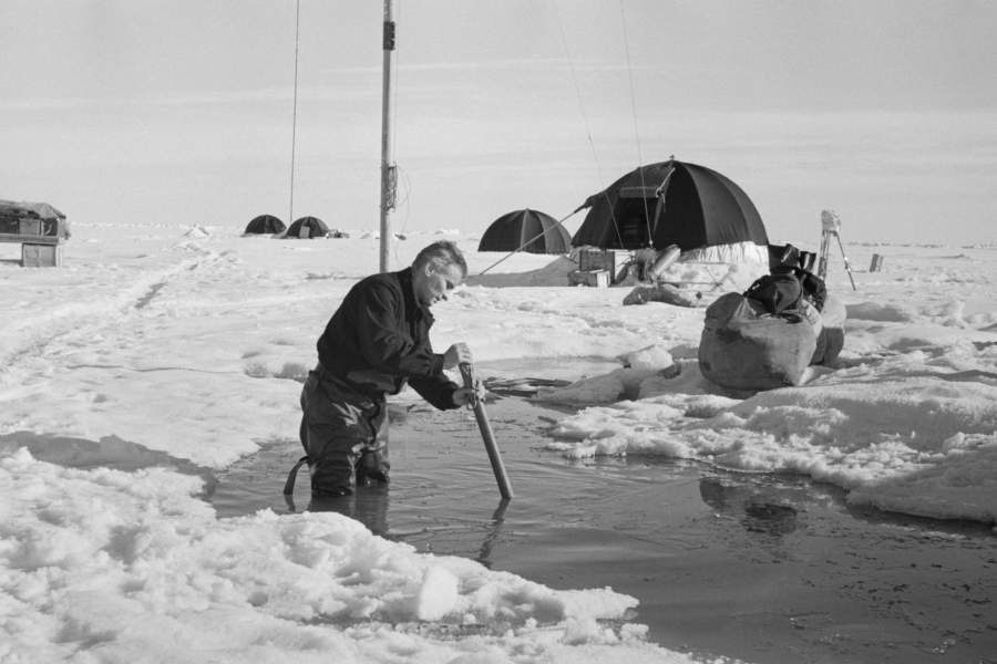 Исследования Арктики были прерваны с началом Великой Отечественной войны, в полной мере вернулись к ним уже в 1950-е. На фото: работа дрейфующей станции «Северный полюс – 3», 1954 год. Метеоролог замеряет температуру воды в полынье