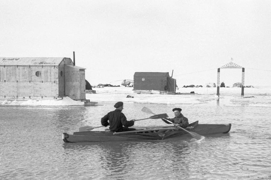 Станция «Северный полюс – 6» была открыта в 1956 году и просуществовала до 1959-го. В том числе ее сотрудники поддерживали в рабочем состоянии ледовый аэродром. На фото: командир экипажа вертолета и его штурман на байдарке во время наводнения