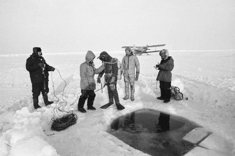 Аквалангисты-океанологи полярной станции «Северный полюс – 22», начавшей работу в 1974 году, готовятся к спуску в полынью