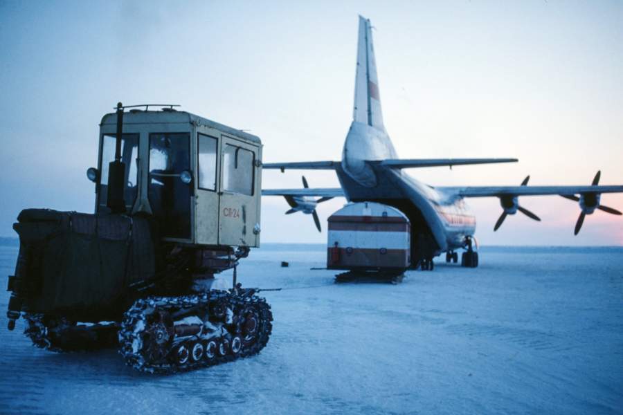 Разгрузка самолета на территории научно-исследовательской станции «Северный полюс – 24», апрель 1979 года