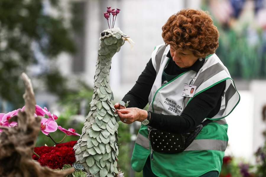 Сотрудница Королевского садоводческого общества наводит последний лоск на павлина перед визитом патронессы выставки, королевы Елизаветы II