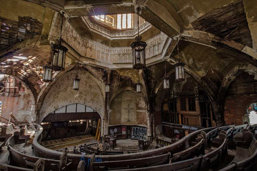 Интерьер городской пресвитерианской церкви, которая входит в число главных достопримечательностей города. Она стоит пустой с 2005 года